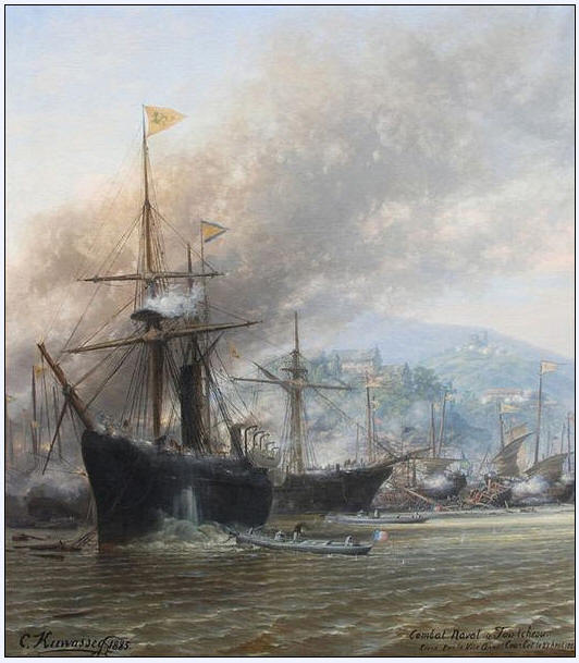 titre "Le combat naval de Fout Cheou" peint part Charles Kuwasseg,