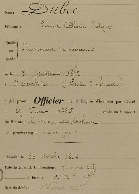 Officier de la Légion d'Honneur du 27 février 1885 sur proposition