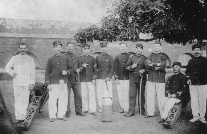 Photo , Castel de Gorée 1886, Duprey au centre avec canne ;archives