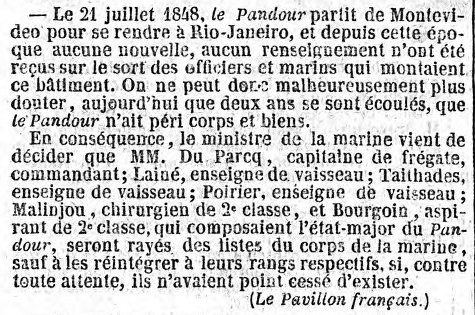 En 1845, le lieutenant de vaisseau du Parcq a été nommé chevalier de
