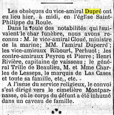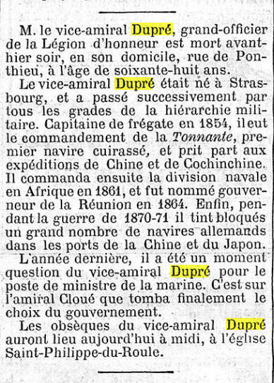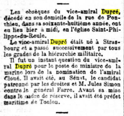 Nommé vice-amiral en 1875, Dupré est préfet maritime de