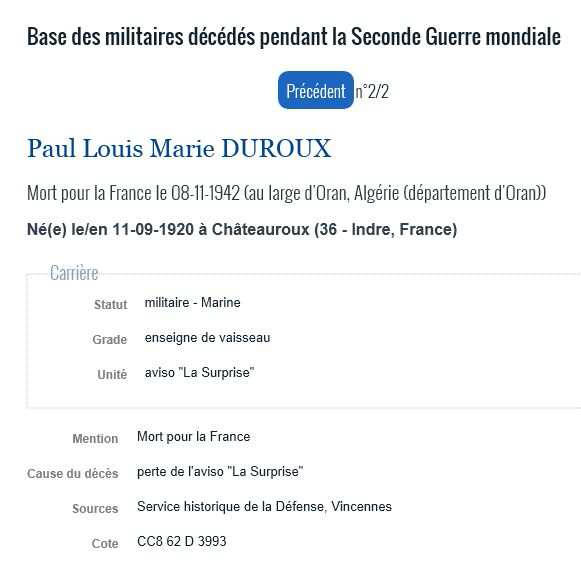 (Indre) - Décédé le 8 novembre 1942 au large d'ORAN