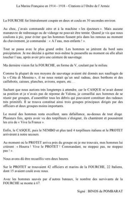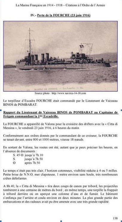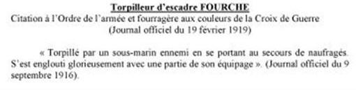 torpilleur "FOURCHE", il est cité à l'ordre de l'Armée navale :