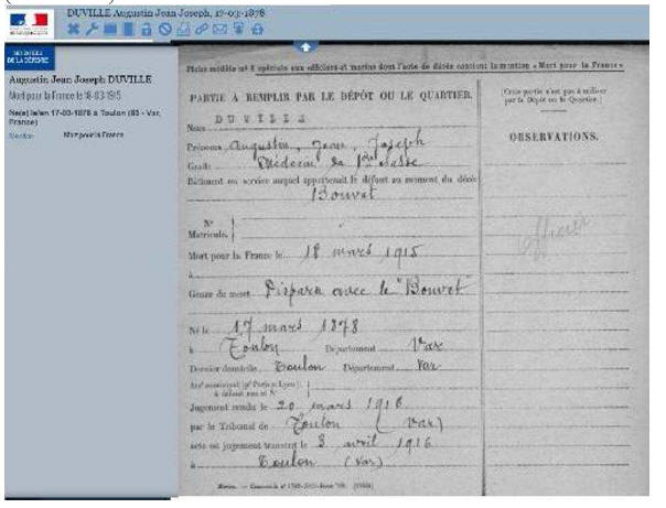 décès rendu le 20 mars 1916 à TOULON. Paul ROQUE