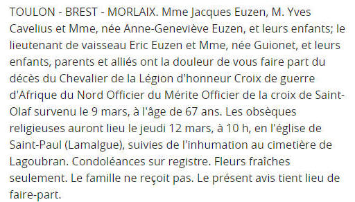 MORLAIX (Finistère) - Décédé le 9 mars 1998 à TOULON (Var)