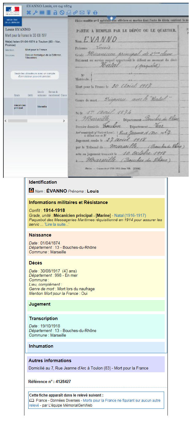 MARSEILLE (Bouches-du-Rhône) - Disparu le 30 août 1917 en mer, au