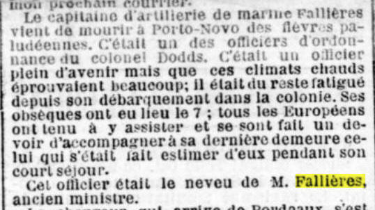 Décédé le 8 juillet 1892 à PORTO-NOVO, DAHOMEY.