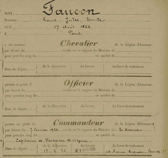 d'Honneur, décret du 7 février 1924; dans le cadre de réserve.