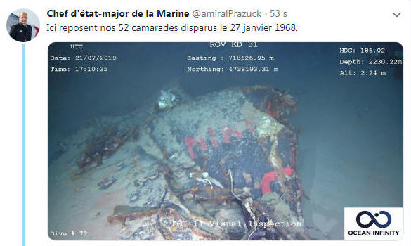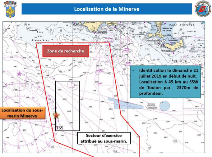 Le sous-marin a été localisé par 2.370 mètres de fond à 45km au Sud-Sud-Ouest