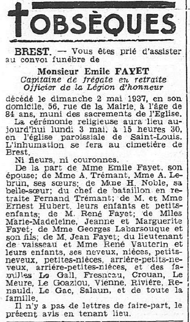(Finistère) - Décédé le 2 mai 1937 à BREST (Finistère)