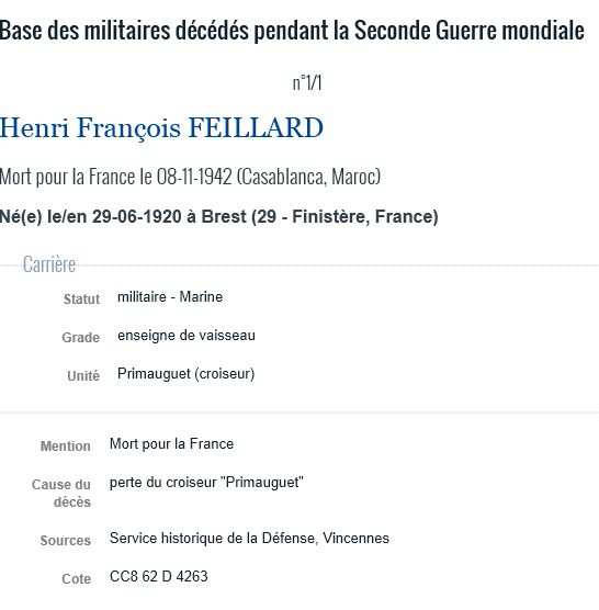 Feillard a reçu la citation suivante à l'ordre de l'armée de Mer :