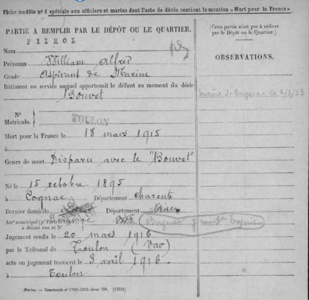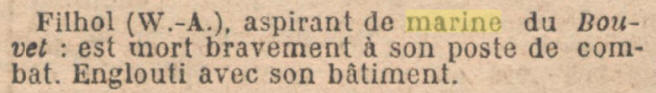 à l'ordre de l'Armée : "Mr Filhol (W. A) aspirant de marine du