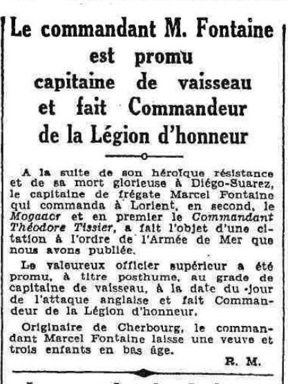 d'Honneur le 1er juillet 1941, cité à l'ordre de l'Armée navale :