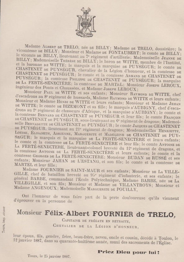 TOURS (Indre & Loire) - Décédé le 12 janvier 1887 à TOULON