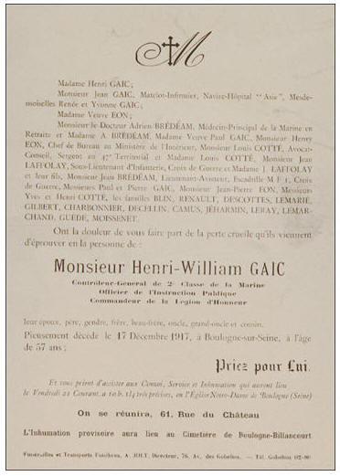 Décédé le 17 décembre 1917 à BOULOGNE sur SEINE