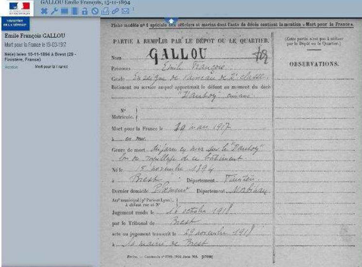 décès rendu le 16 octobre 1918 à BREST et transcrit dans cette