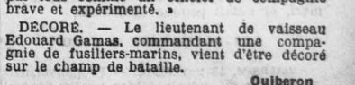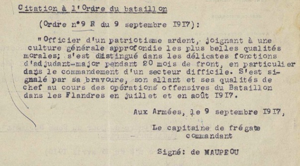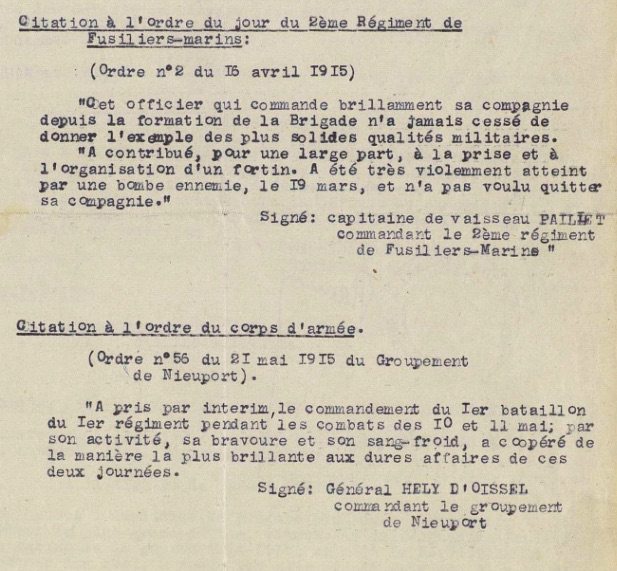 deux reprises à l'Ordre de l'Armée navale : " 1ère citation