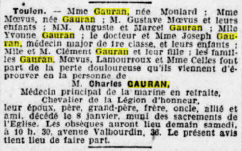 épouse le 26 mai 1910 Thérèse Léonie GAURAN à TOULON (Var)