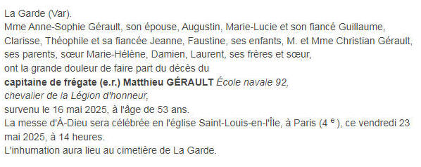 Obsèques le 23 mai 2025 en l'église de Saint Louis en l'Ile (Paris