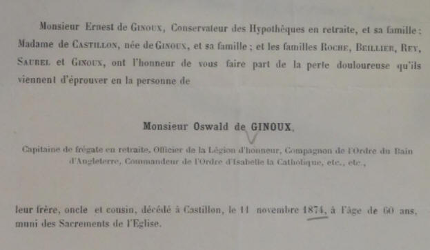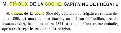 (Isère) - Décédé le 11 novembre 1874 à Le BEAUSSET (Var), au Château