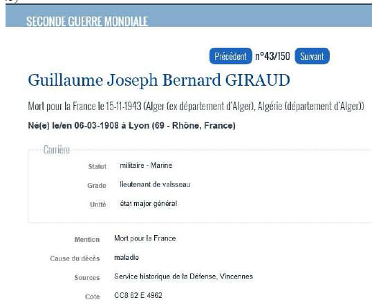 LYON (Rhône) - Décédé le 15 novembre 1943 à l'Hôpital d'ALGER.