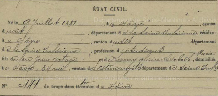 Né le 9 juillet 188 1 au HAVRE (Seine Maritime) - Décédé