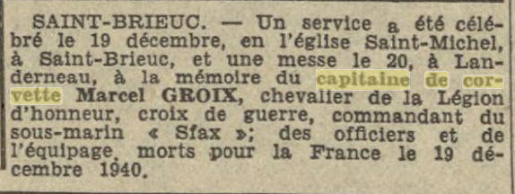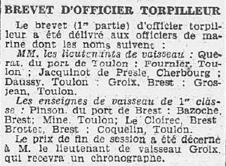 du 20 février 1941, le lieutenant de vaisseau Groix a été promu