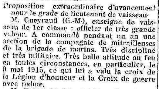 des Fusiliers Marins, il est cité à l'ordre de l'Armée navale en