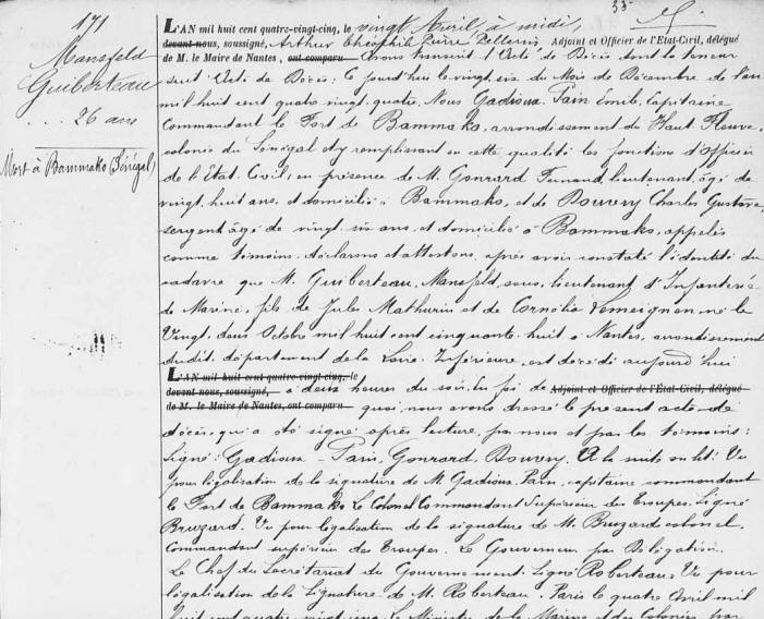 Acte transcrit à NANTES le 20 avril 1885 (6ème Canton acte N° 171)