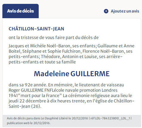 (Isère) le 3 janvier 1925, décédée le 18 décembre 2016 à ROMANS SUR