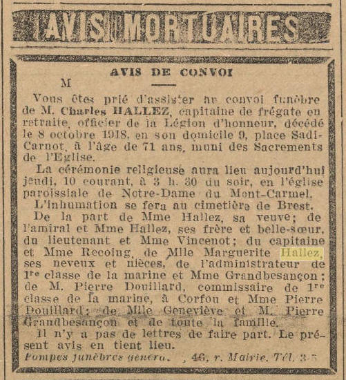 Décédé le 8 octobre 1918 à BREST (Finistère)