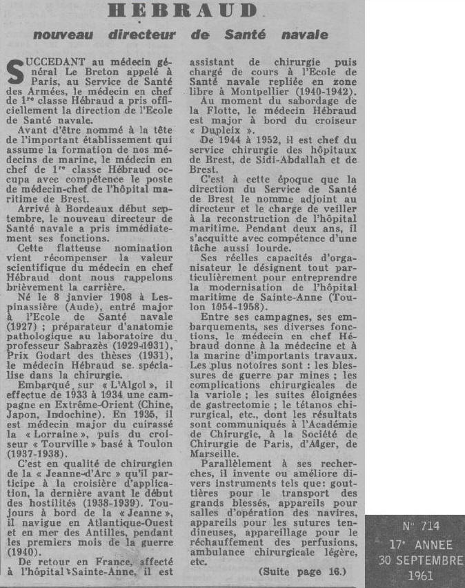 Au 1er janvier 1959, Médecin-Chef de l'Hôpital maritime