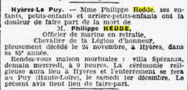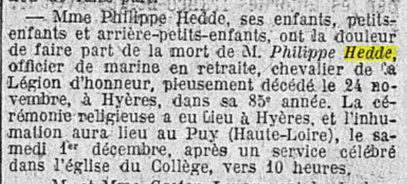 Loire) - Décédé le 24 novembre 1923 à HYERES (Var)