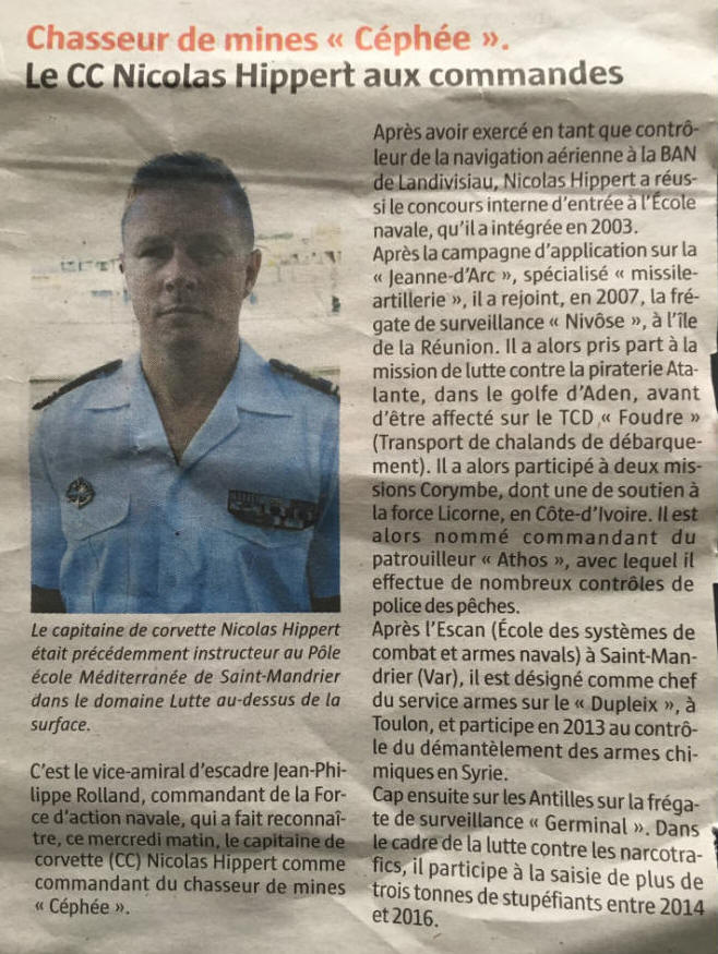 Prend le commandement le 18 juillet 2018 du chasseur de mines Céphée