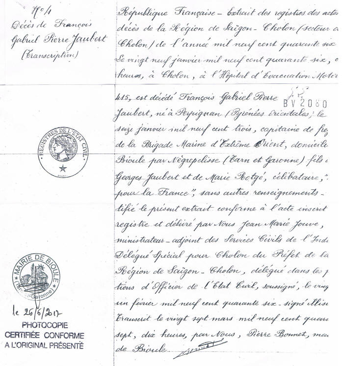 29 janvier 1946 à CHOLON (Sud Vietnam)