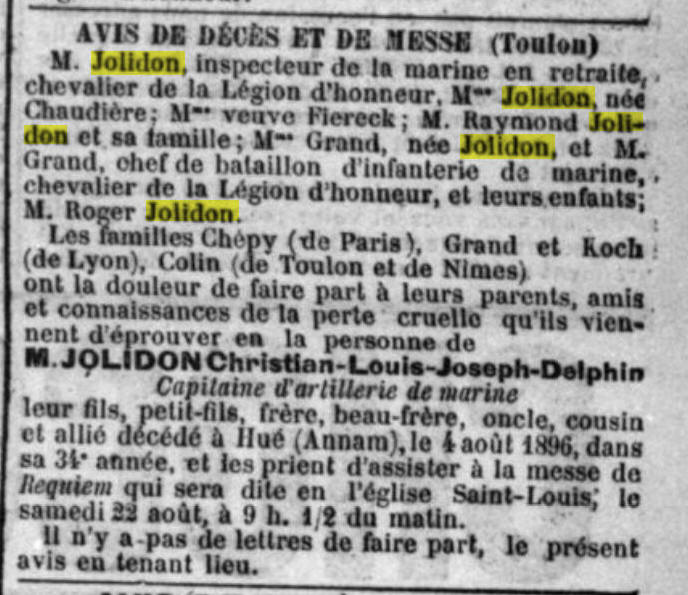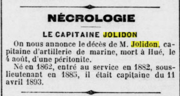Né le 20 juin 1862 - Décédé le 4 août 1896 à HUE (Indochine)