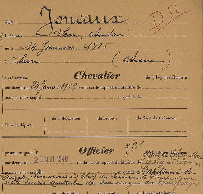 d'Honneur le 25 août 1948, alors Capitaine de frégate honoraire,