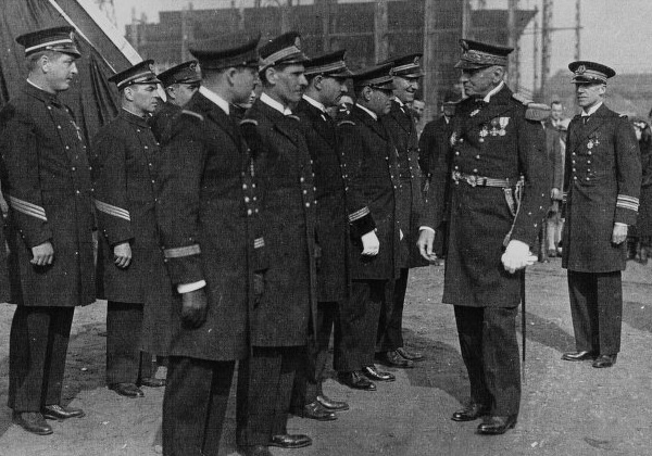 suivi du commandant Krantz, passe en revue les officiers du