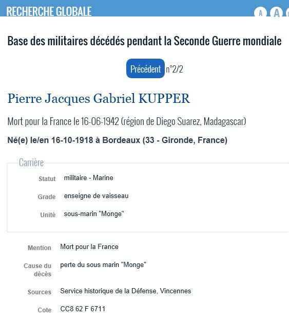 décès, officier en quatrième sur le sous-marin "MONGE"