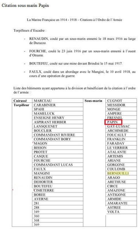 (Cdt Jean Pierre COCHIN), il est cité à l'ordre de l'Armée navale en