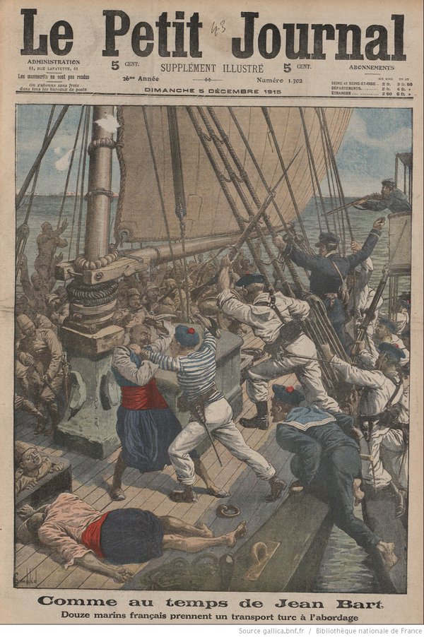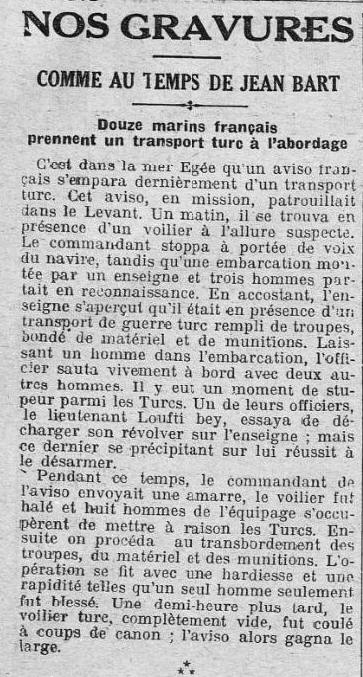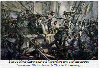 l'abordage d'une goélette turque transportant 11 officiers et 50