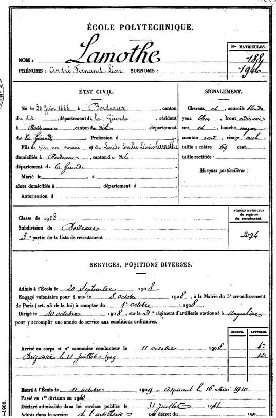 polytechnique le 1er octobre 1908, opte pour l'Artillerie de Marine.