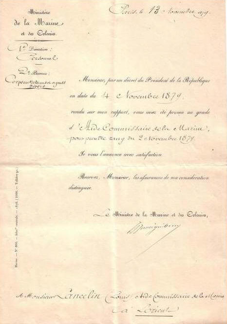 qualité d'Elève-Commissaire le 1er novembre 1877, port TOULON.
