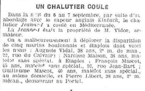 sur le patrouilleur auxiliaire "JEANNE-I", il disparaît avec le
