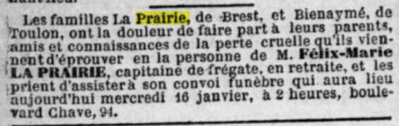 (Morbihan) - Décédé le 14 janvier 1889 à MARSEILLE (Bouches du