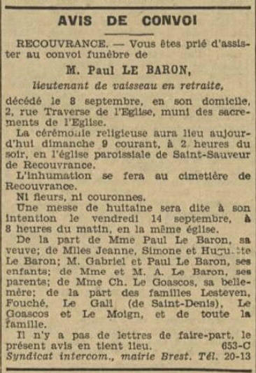 Décédé le 8 septembre 1934 à RECOUVRANCE (Aujourd'hui quartier de
