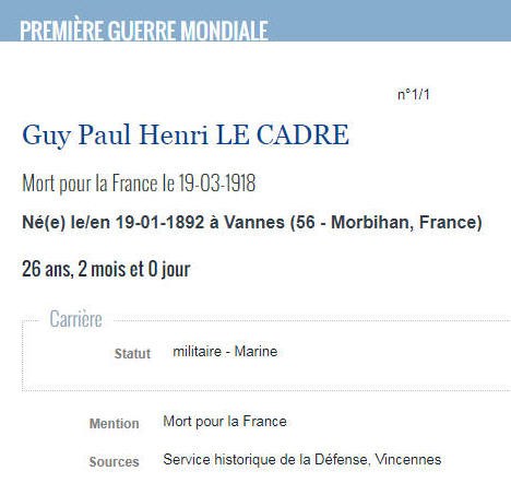 VANNES (Morbihan) - Décédé le 19 mars 1918 à VANNES (Morbihan)