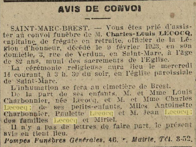 (Manche) - Décédé le 9 février 1923 à BREST (Finistère)