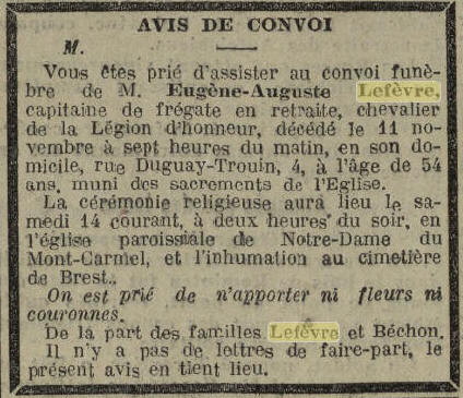 (Finistère) - Décédé le 11 novembre 1914 à BREST (Finistère)