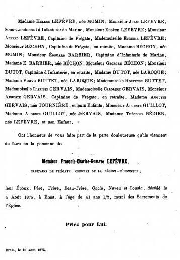(Finistère) - Décédé le 4 août 1875 à BREST (Finistère).